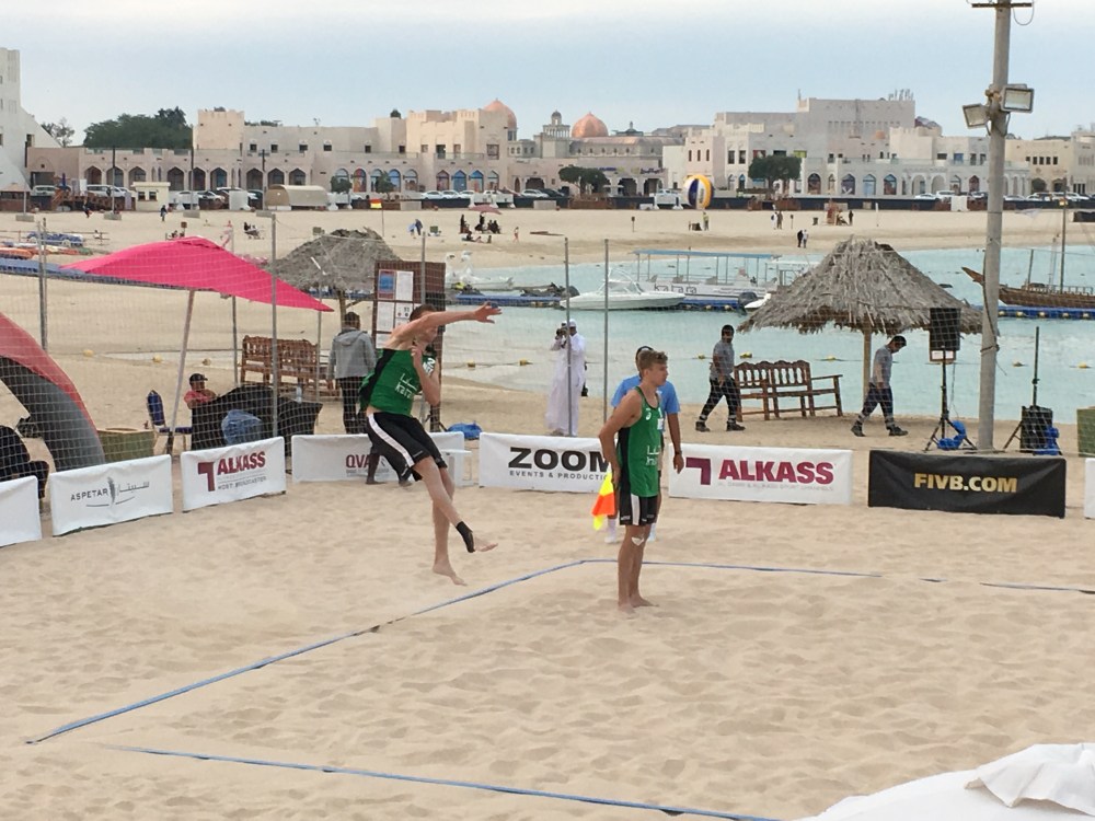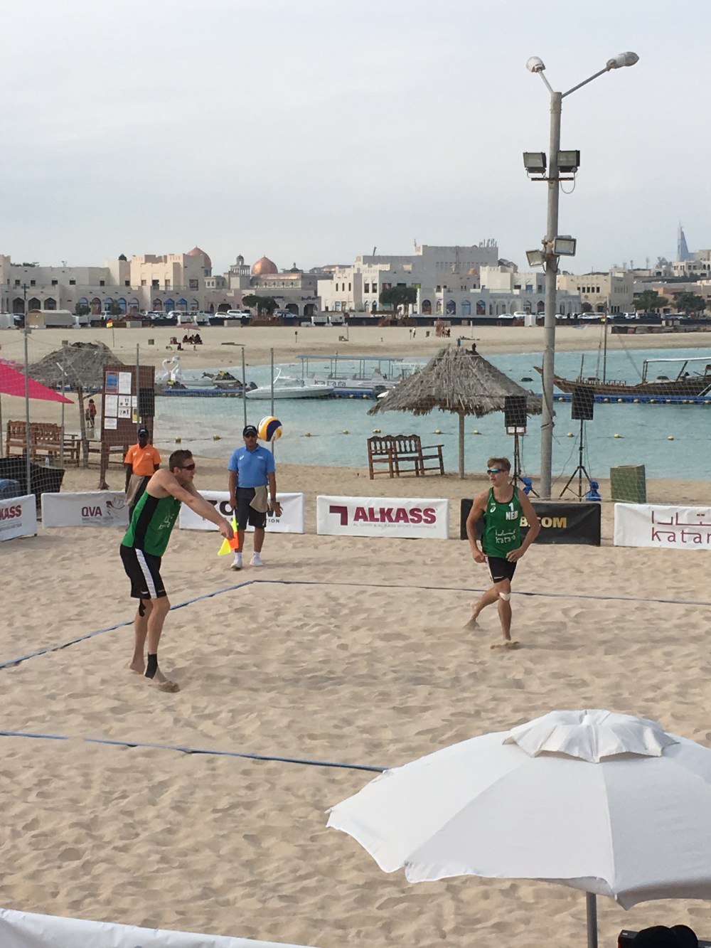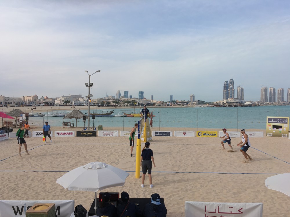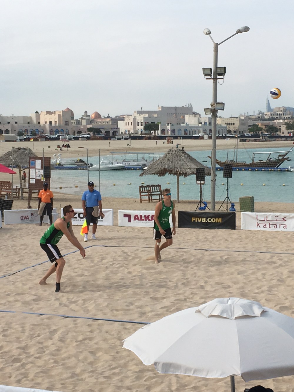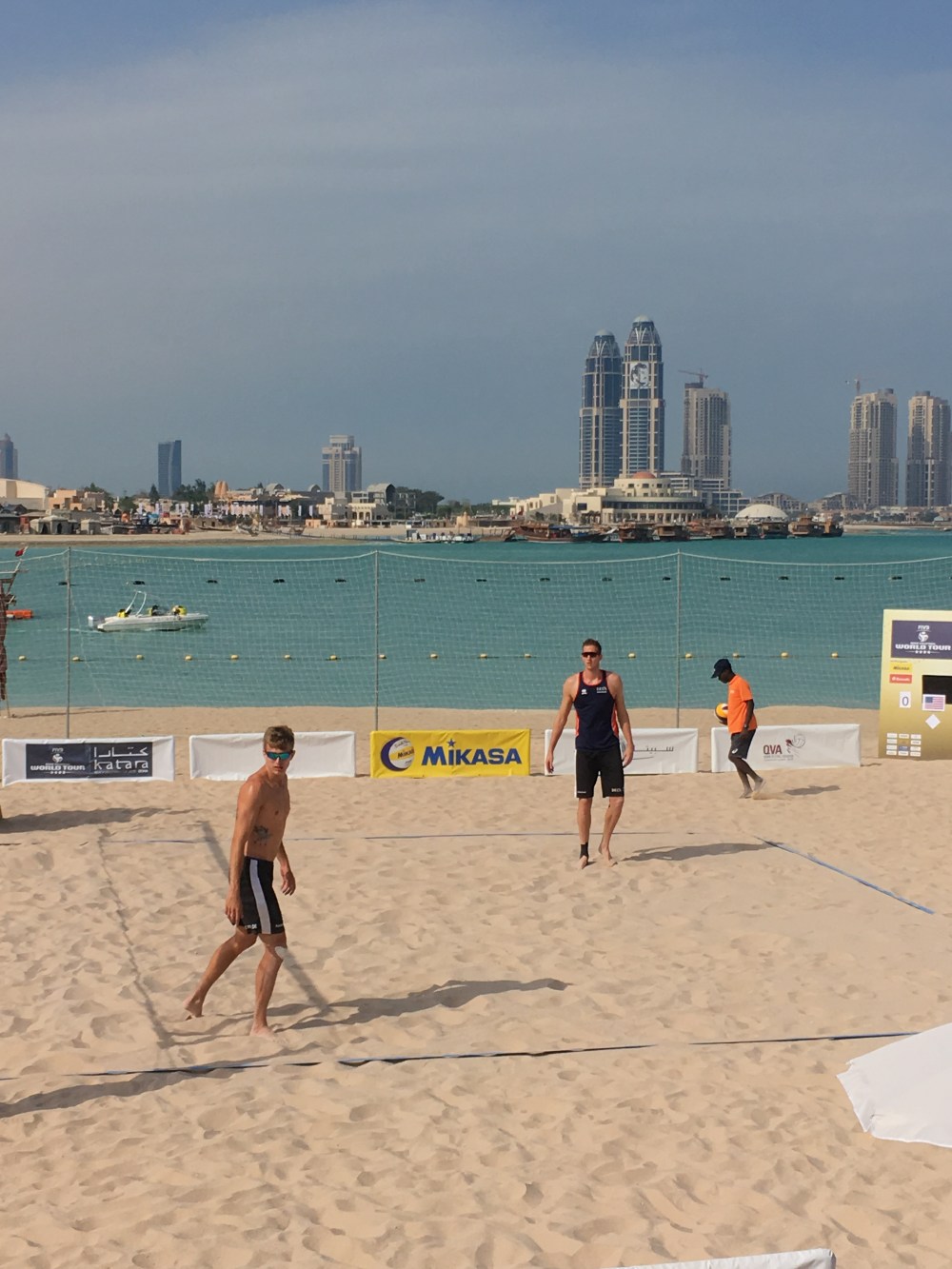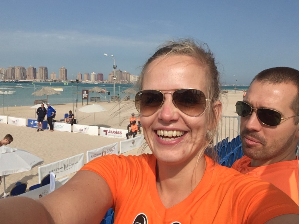 Via Facebook kwam ik er achter dat, op het strand van Katara, waar wij tegenwoordig op uitkijken, (#Ilovemybalcony) het Worldtour beachvolleybal toernooi gespeeld werd. En ook vandaag mochten er Nederlandse topspelers in actie komen. In de ochtend hadden we de wedstrijd die de Nederlandse duo’s tegen elkaar moesten spelen helaas gemist, maar ‘smiddags zaten we in onze oranje t-shirtjes op de tribune voor match nummer 2, met de winnaars van die ochtend. Lang leve de social media kanalen, want echt goed aangegeven waar het toernooi was stond het nou ook weer niet.