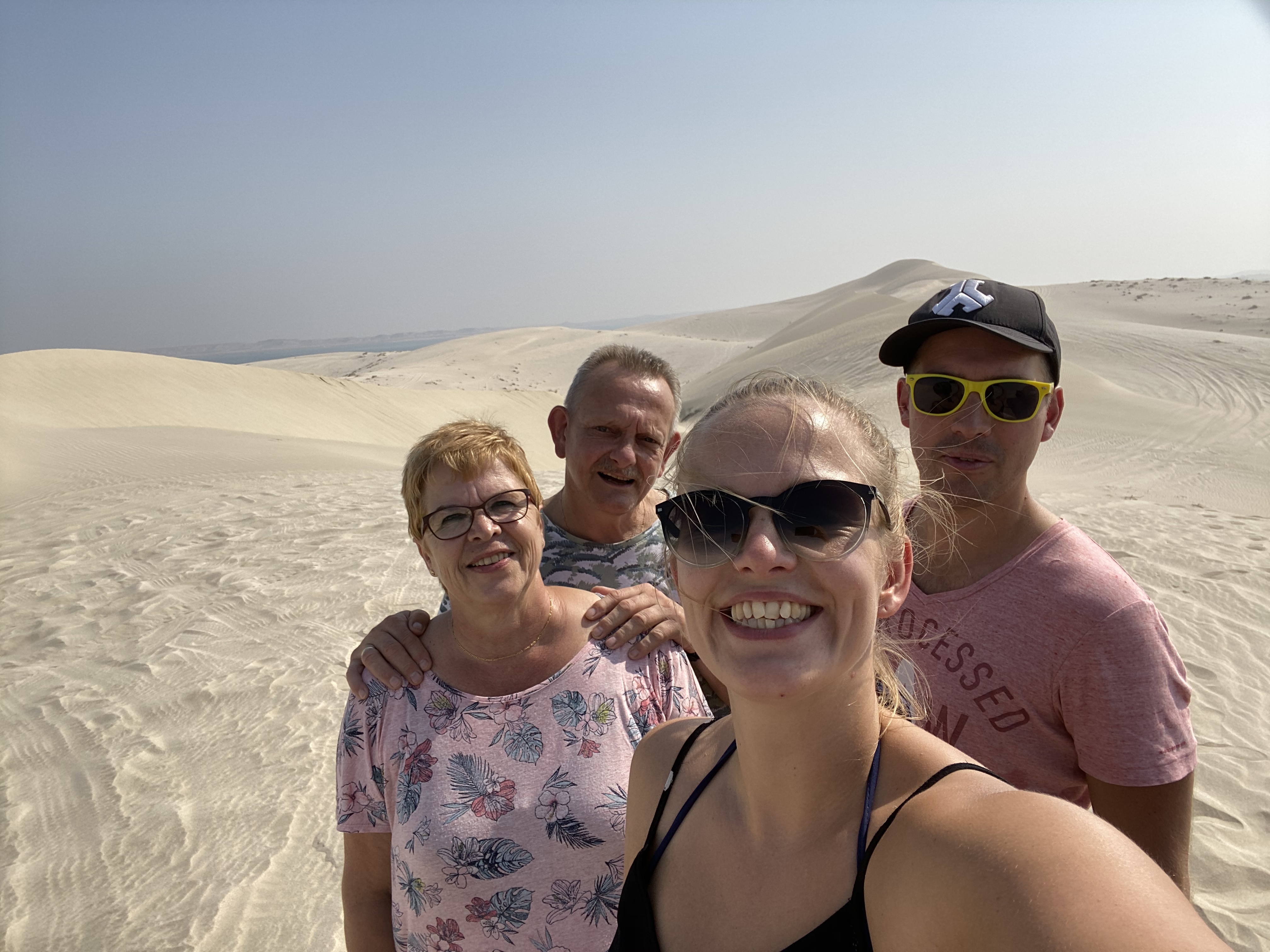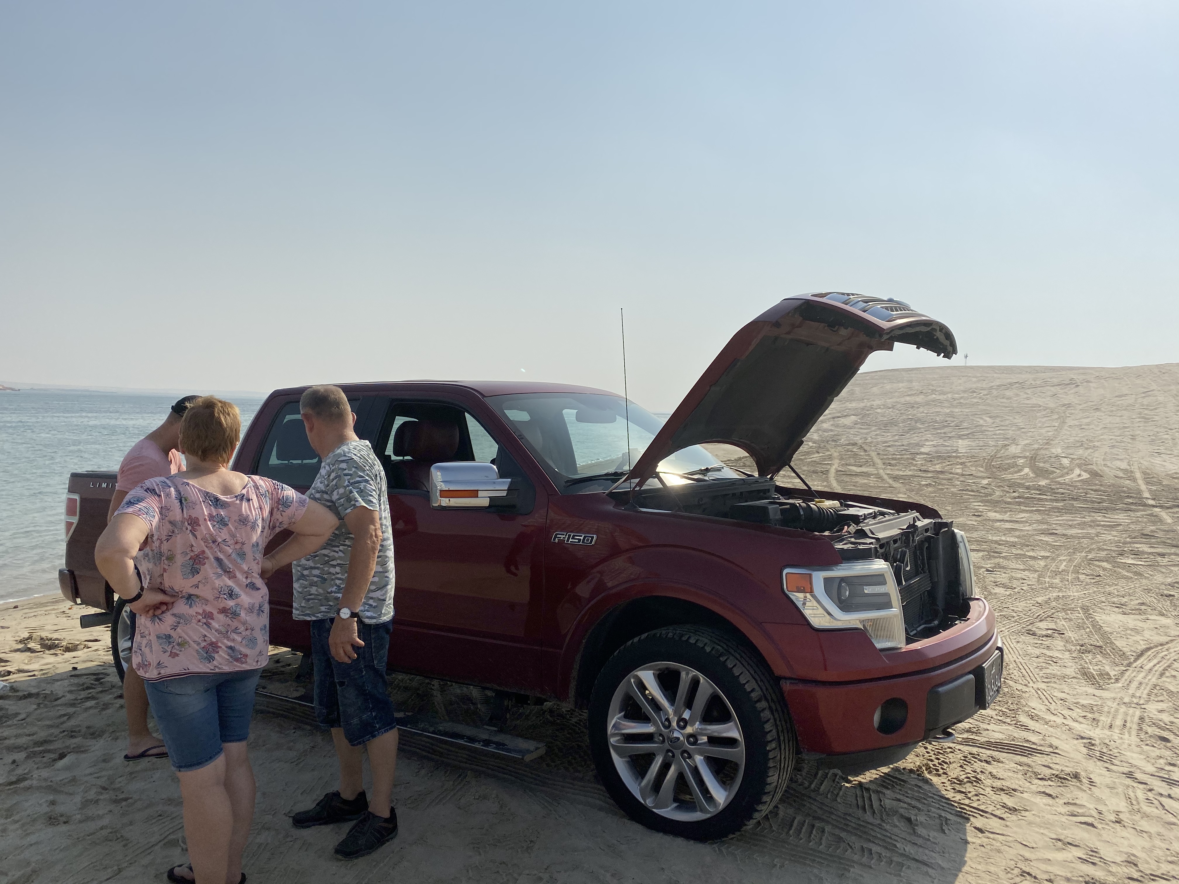 De dag begon leuk. Rik vond het wel tijd worden dat Samantha de Ford 150 op z’n staart ging trappen in het zand. Je eigen auto de zandduin op sturen is toch stiekem wel iets anders dan de rental Pajero. En waarbij de Pajero een snelle gang noodzakelijk was om de heuvel op te komen, kan dat in de Ford verbazingwekkend rustig en beheerst. Wat een vermogen zeg in die motor, fantastisch! Achterin zat een vader stiekem wel een beetje trots te zijn op zijn ‘kleine meisje’. Tot we vastzaten. Op best een vlak stukje zand, maar wel in best mul zand. De mannen werden aan het werk gezet, terwijl de dames in de heerlijk gekoelde auto het gaspedaal in werking moesten zetten. Toen Sam de auto vervolgens omlaag moest werken met enig stuurwerk, werd besloten dat er genoeg geoefend was voor vandaag. Dat doen we een volgende keer wel weer. En zo mochten de mannen voorin zitten en het stuur overnemen.
