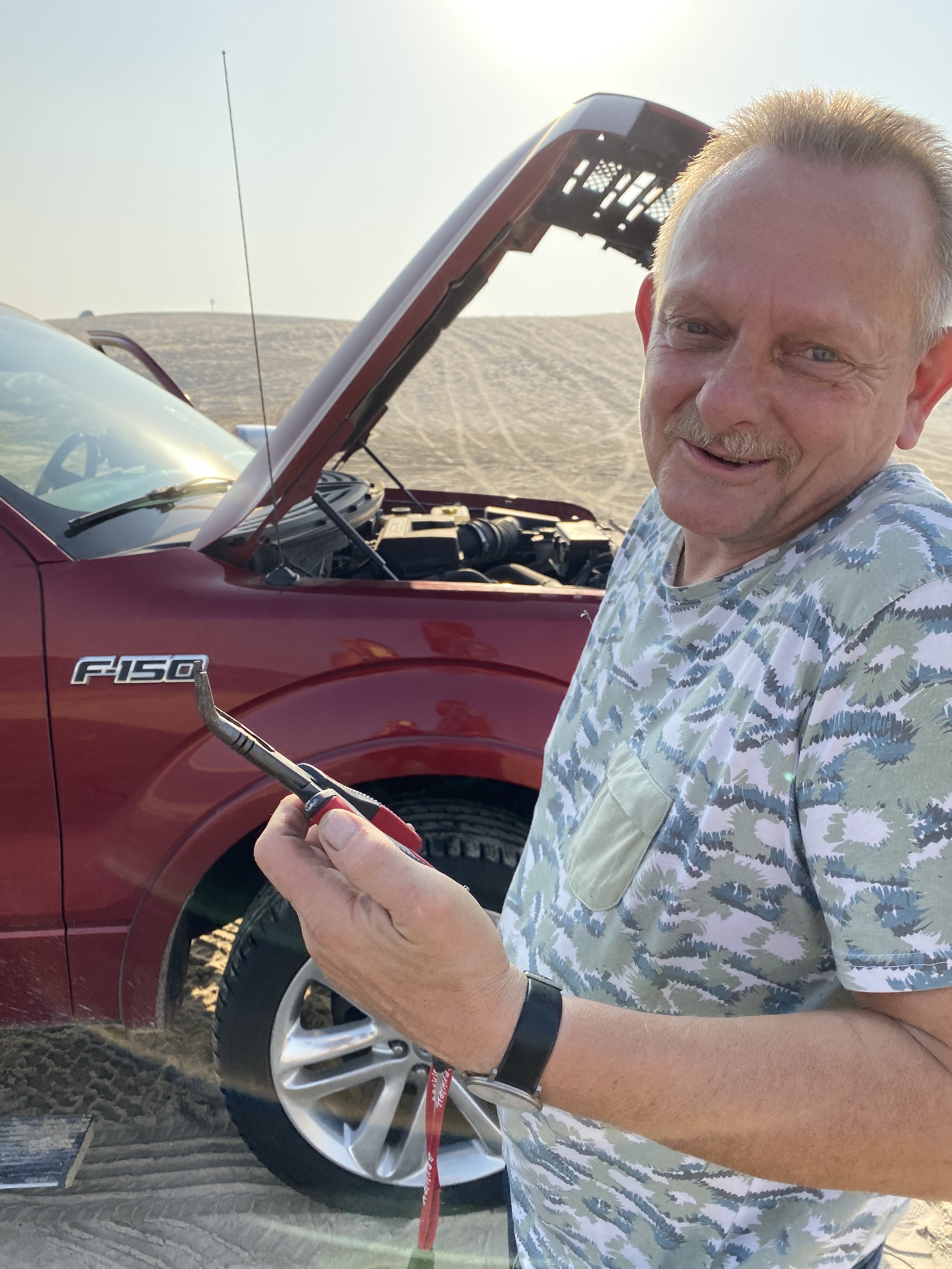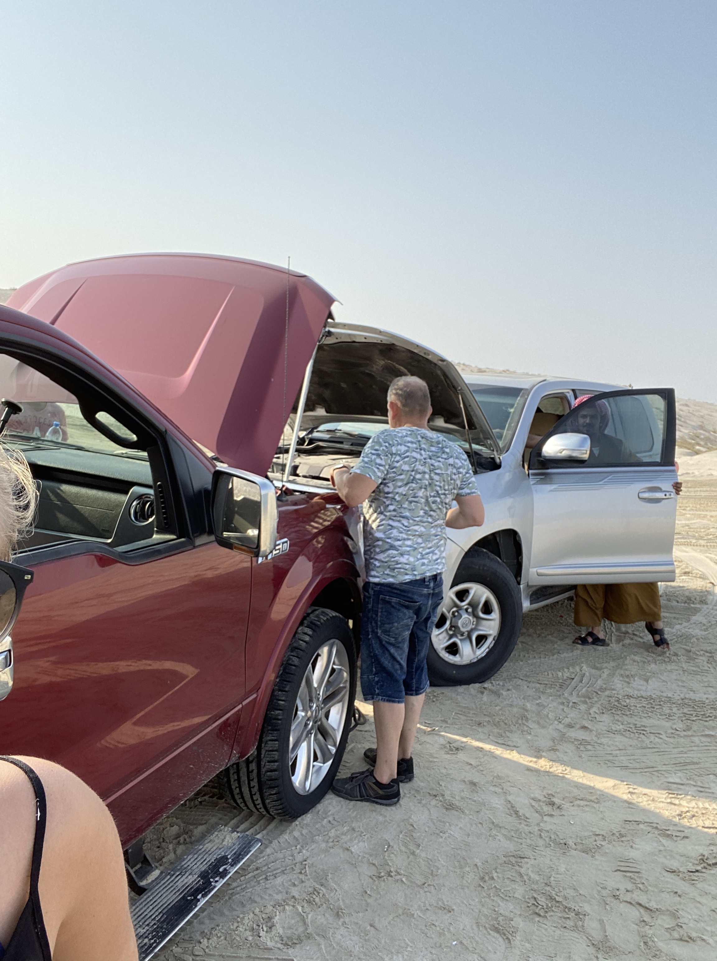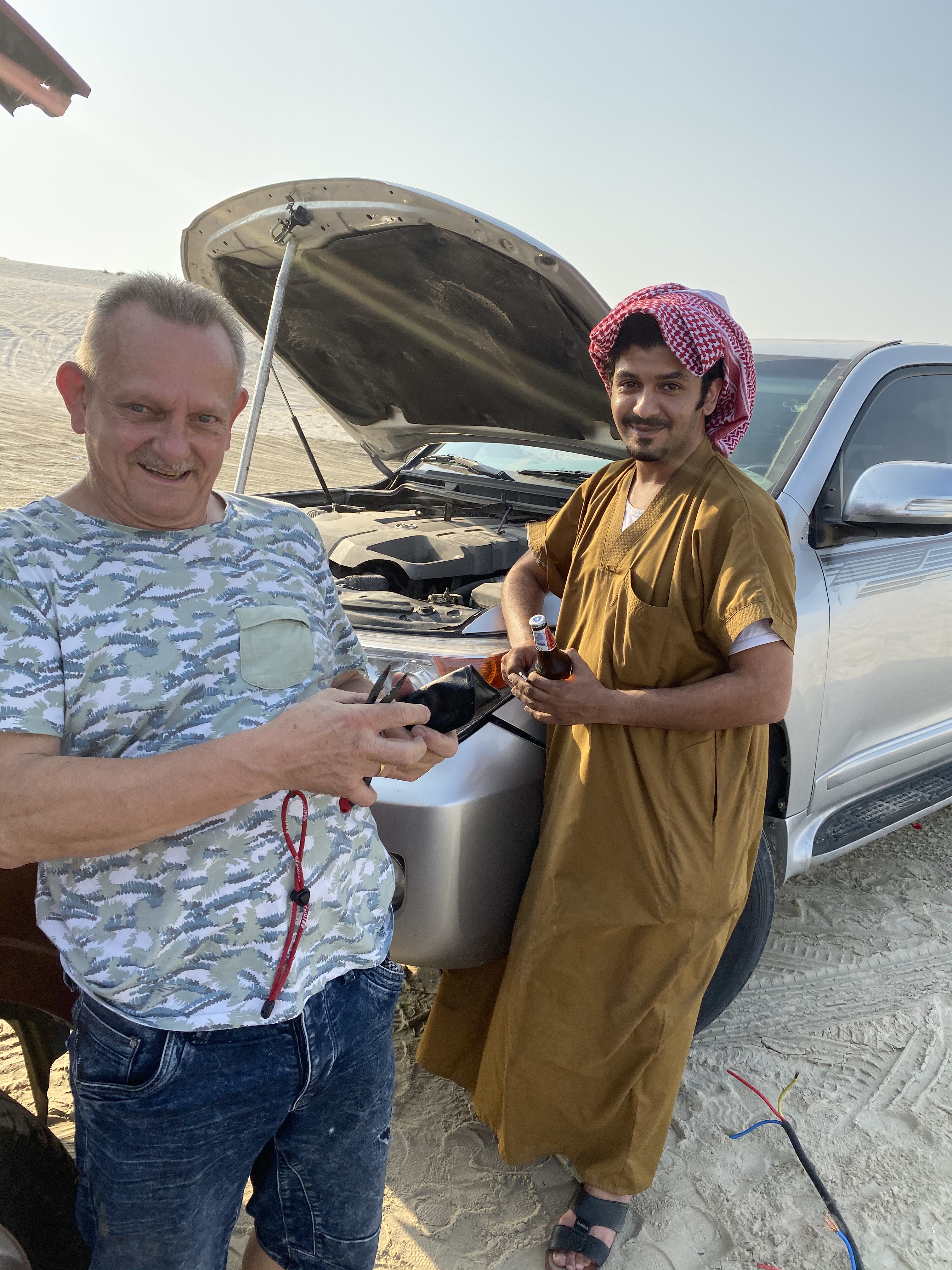 Bij een wat verlaten ogende plek kwam toch ineens beweging. Het woordje ‘Help’ heeft gelukkig een internationale betekenis en na een korte uitleg werd een auto gestart, iets wat op startkabels leek meegenomen en konden we met een man mee terugrijden naar onze auto, die daar zielig met een open motorkap stond. De route naar onze auto betrof een steile zandduin die wij zelf nooit zomaar zouden durven te nemen. Je kunt altijd nog wat leren van de mensen die wonen in de woestijn. Hoe grappig! Eenmaal aangekomen had Moeders het zich inmiddels makkelijk gemaakt in een stoeltje in de schaduw, vaders had een tang gevonden in het zand en besloot dat die gelijk dienst kon doen en zo begon Operatie auto starten. Vastzitten door een kapotte accu, het is weer eens wat anders dan vastzitten in het zand. Dit keer hoefden we niet zoveel te graven.
