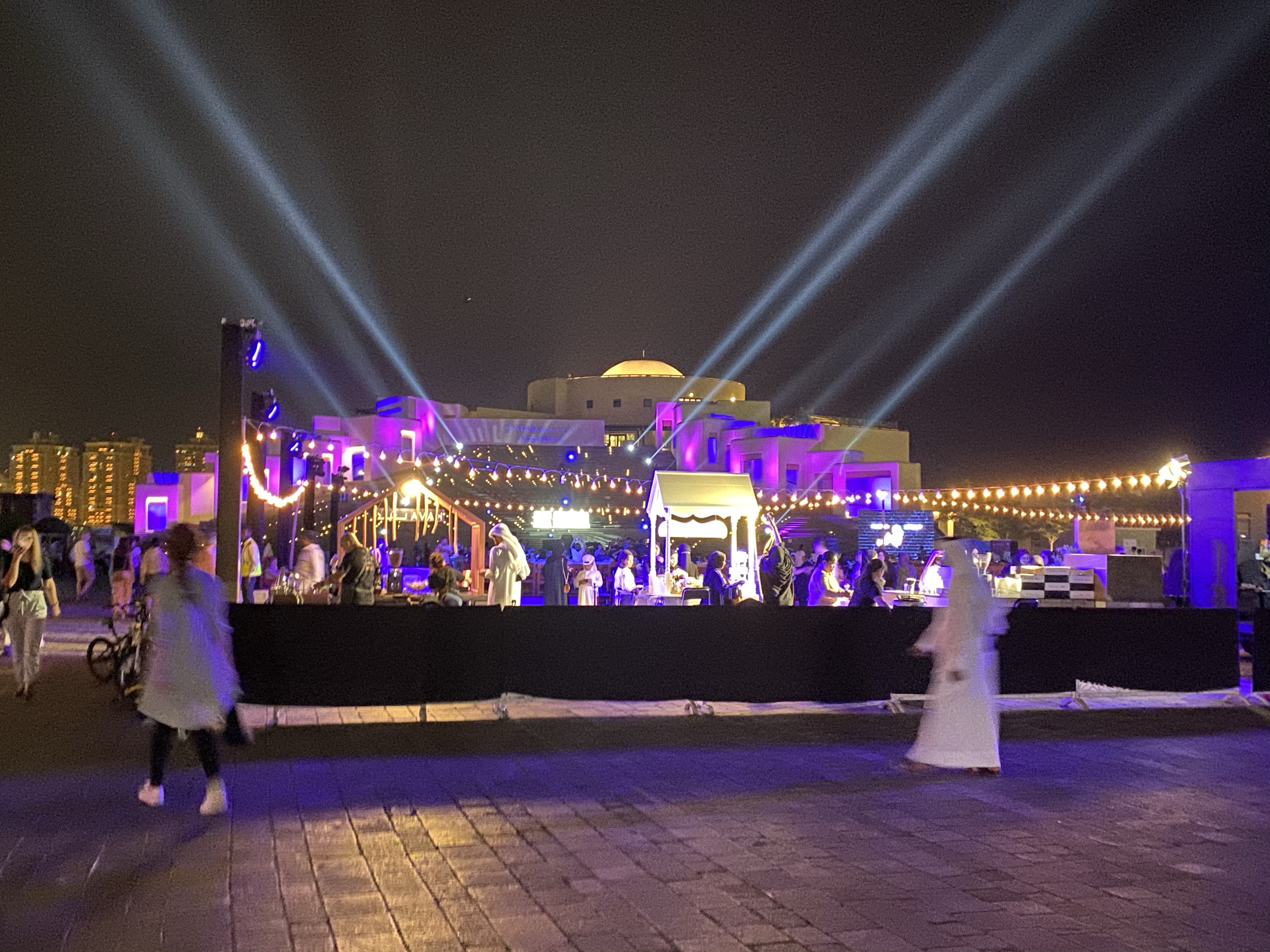 Na de Portugezen waren namelijk de Italianen aan de beurt. Een plaatje van een man met een saxofoon en een cello die werd klaargezet beloofde veel goeds. De psychedelische klanken werden ingeruild voor wat rustigere muziek, precies zoals we ons hadden voorgesteld en inmiddels was het toch ook best wel druk geworden. Altijd leuk want mensen kijken is toch puur vermaak?! Zeker als je bedenkt dat er ook dames in Qatar rondlopen die geen moeite doen om hun schouders en knieën te bedekken. Je ziet de mooiste creaties voorbij lopen, en dat naast alle abaya’s. Het contrast blijft groot. Ondertussen leek de Italiaanse zangeres de saxofoon na te zingen en wij hadden meer oog voor de mensen die een zitplekje najoegen. Tijd om op te stappen dus.
