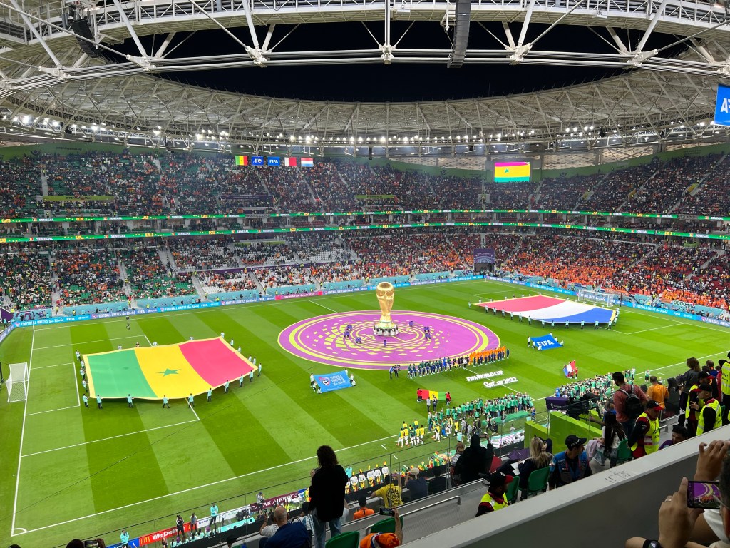 Achter het doel van Senegal op de tribunes zagen we een grote oranjevlek van mensen ontstaan. Marlene en ik zaten niet bepaald tussen de Hollanders, maar ondanks dat wel genoeg fans van het Nederlands elftal om ons heen. Bijzonder en toch verrassend om te zien hoeveel soorten fans er zijn en hoeveel mensen wapperen met onze nationale driekleur. Voordat de wedstrijd begon was er nog een kleine show met wat lichtspektakel en natuurlijk mocht een beetje vuurwerk ook niet ontbreken! En na een tijd wachten kon de wedstrijd beginnen. Enigszins saai maar voor ons genoeg te zien en te beleven. De camera’s in het stadion hebben ons niet gevonden, maar we vielen wel op, twee van die Hollandse dames die helemaal uit hun plaat gingen na het lange wachten op de doelpunten!
